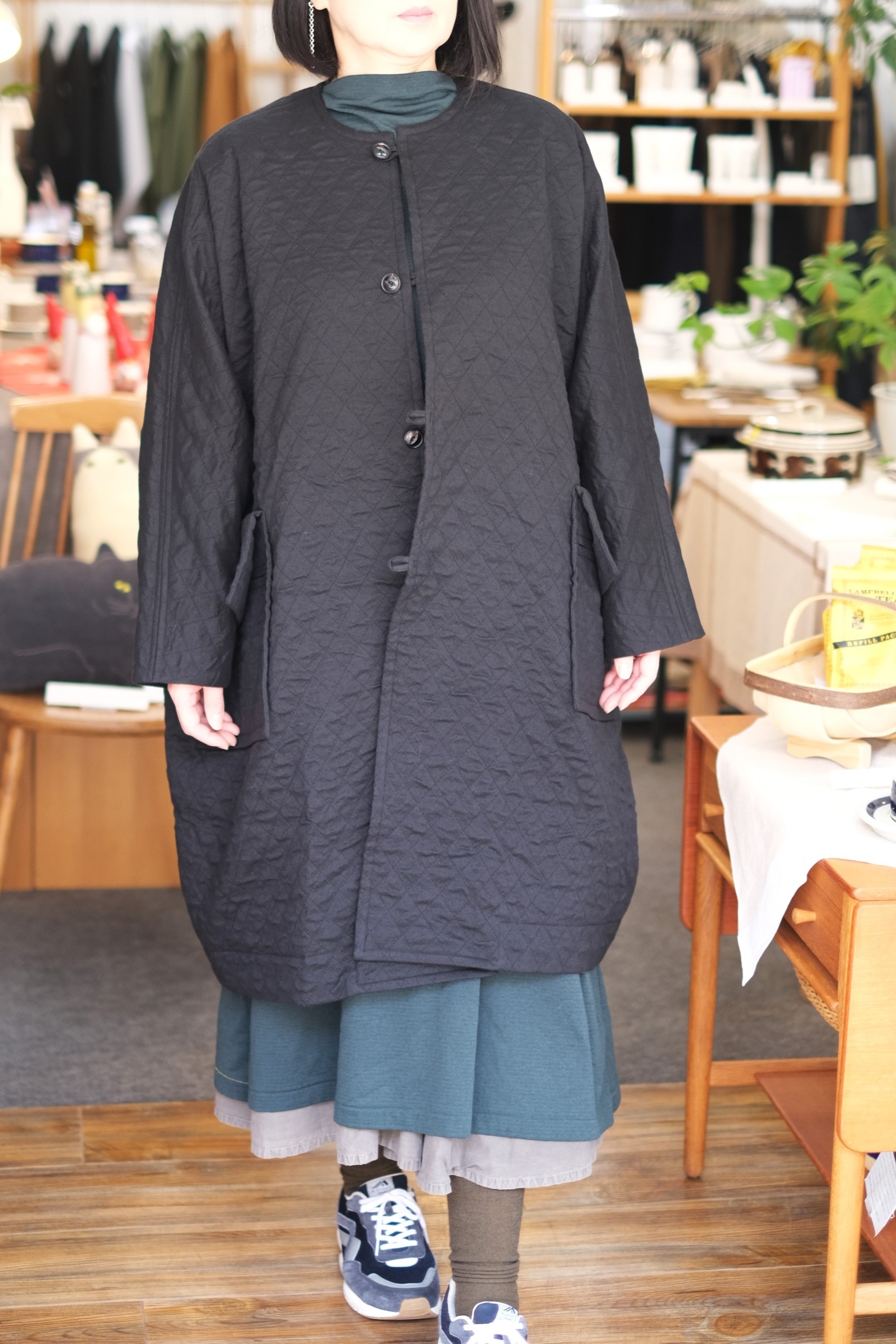 | 11月3日 サリゲナクより新作のキルティングコートが届きました。 新素材のキルティングはダイヤカットのジャカード組織とコットン×ウールの収縮差を生かし、生地そのものに 凹凸と微細な空気層を形成。従来の方法に頼らずキルティングらしさを引き出しつつ、しなやかで軽やかな 着心地を実現しました。 またデザインはラインを隠すたっぷりの分量感が印象的で、手の届くところすべてにポケットを配してます。 (商品名をクリックするとオンラインページへジャンプします) サリゲナク / 泥棒! Drop coat -(FABRITEC / Wool?Cotton Jacquard Quilting)¥88,000 (税込) |